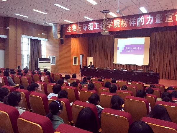 在全党全国人民深入学习贯彻党的十八大和十八届三中、四中五中全会精神的新形势下,为深入贯彻落实党中央和习近平总书记系列讲话精神,引导广大青年学生为实现中华民族伟大复兴而努力奋斗,按照校团委“践行社会主义核心价值观,争做向上向善好团青”主题团日活动要求,3月9日下午,生物与环境工程学团委在校明德楼A区报告厅举办了与信仰对话—榜样的力量主题团日宣讲会。校团委副书记武文斌、学生工作处教育管理科科长李承出席了此次主题团日活动,生物与环境工程学院近200名团员青年参加了此次活动活动由2013级环境生态工程专业白明皓同学主持。