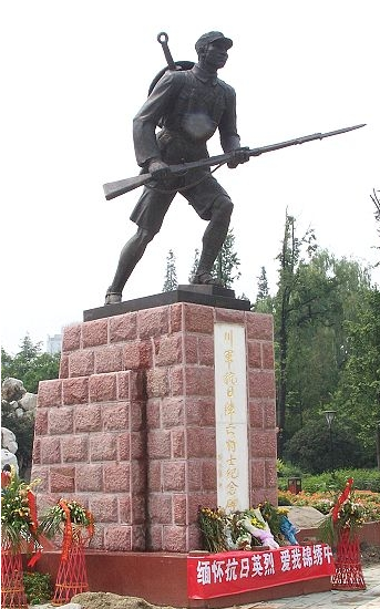 7月7日,全民族抗战爆发77周年。我校实践队员来到川军抗日阵亡将士纪念碑。该纪念碑是为了纪念在抗日战争中阵亡的60多万川军而于1944年修建的。纪念碑上一位川军士兵,穿着短裤、绑着绑腿,背着斗笠大刀、手握步枪,胸前悬挂两颗手榴弹,注视前方,就像即将冲锋的战士。实践队员们在纪念碑前用鲜花祭奠遇难同胞,感恩阵亡先烈。偶遇成都吉小宝文化艺术中心创建人吉小宝先生的个人纪念抗日英雄画展,他与实践队员亲切交谈,与我们合影留念。此次活动引起成都市广播电台的关注,记者采访了校学生会主席文章同学。